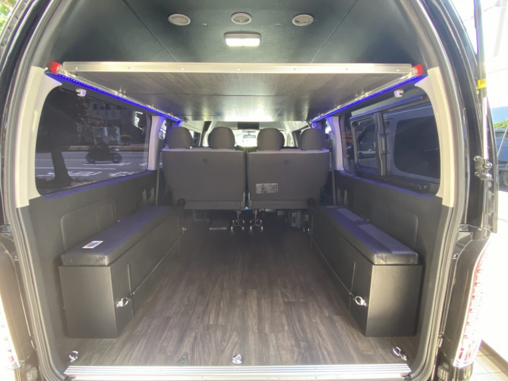 ※ 後方の荷室は2600mm×1730mmで1000ccのSSクラスで2台積み可能です! ※ ベース車はスーパーロングワゴン車の特別オーダー車です! ※ 快適なリアエアコンと純正パワースライドドアも装備されています!